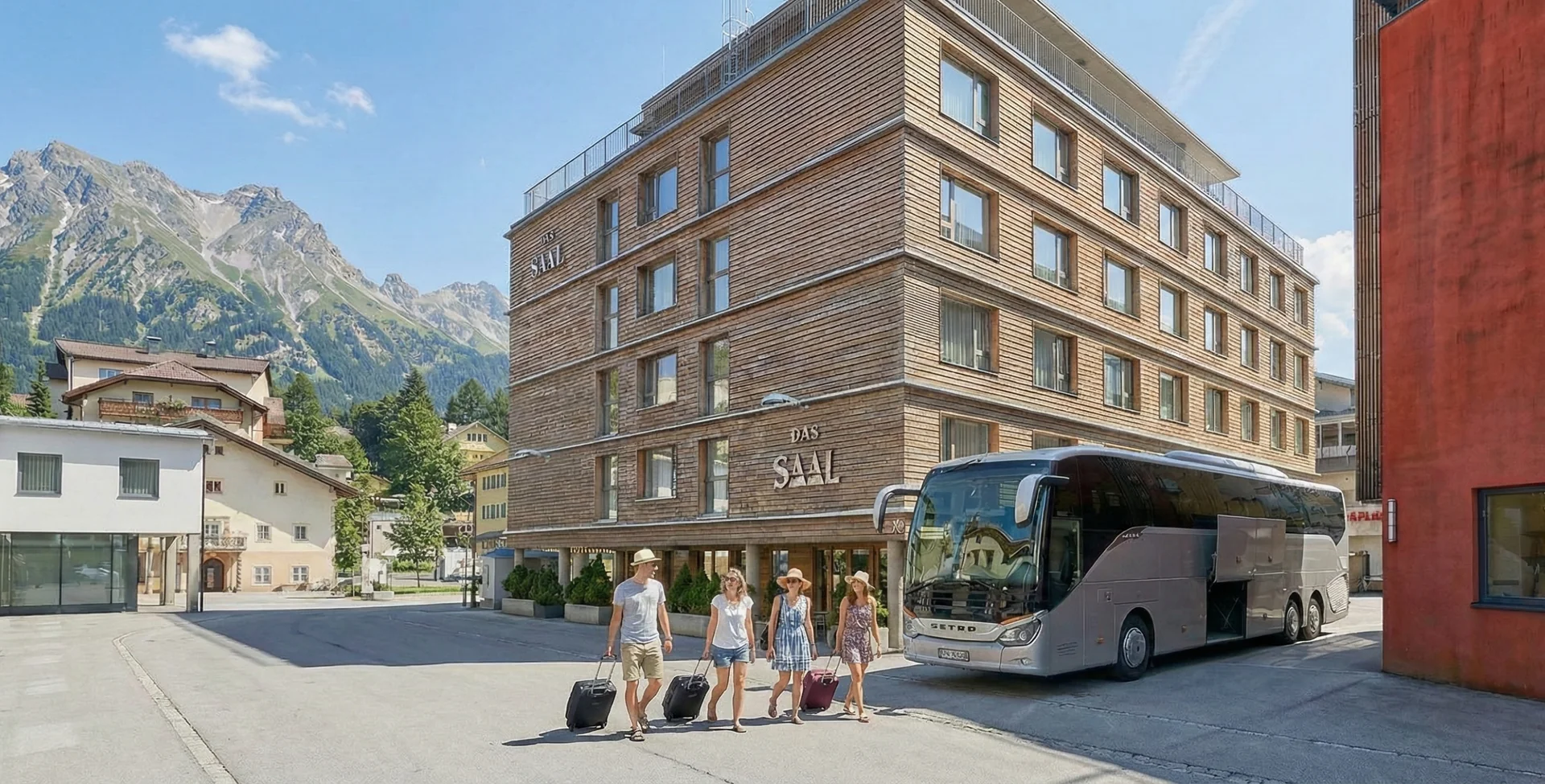 Hotel DAS SAAL con autobús turístico y huéspedes en verano, panorama de montañas al fondo